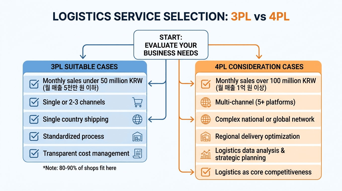 처음부터 4PL을 선택하는 것보다, 3PL로 시작해서 필요할 때 확장하는 것이 현실적입니다.